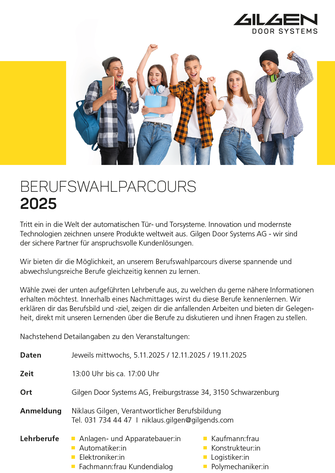 Tritt ein in die Welt der automatischen Tür- und Torsysteme. Unsere Produkte stehen für Qualität und Design. Wir sind in über 70 Ländern tätig und beschäftigen über 1‘300 Mitarbeitende. Komm zum Schweizer Marktführer und lerne deinen Beruf live kennen.