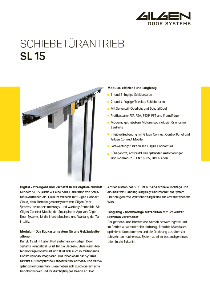 Der SL 15 bietet nicht nur viel Komfort, sondern auch tiefe Unterhaltskosten. Der getriebe- und bürstenlose Antrieb ist außerordentlich laufruhig und frei von Vibrationen. Dies bewirkt einen geringen Verschleiß, bessere Verfügbarkeit und tiefere Wartungskosten über die gesamte Lebensdauer des Türantriebs. Durch die optionale Fernwartungsfunktion von Gilgen Connect IoT entfallen Anfahrtskosten für Interventionen und die Problem-Diagnose erfolgt von überall auf der Welt.