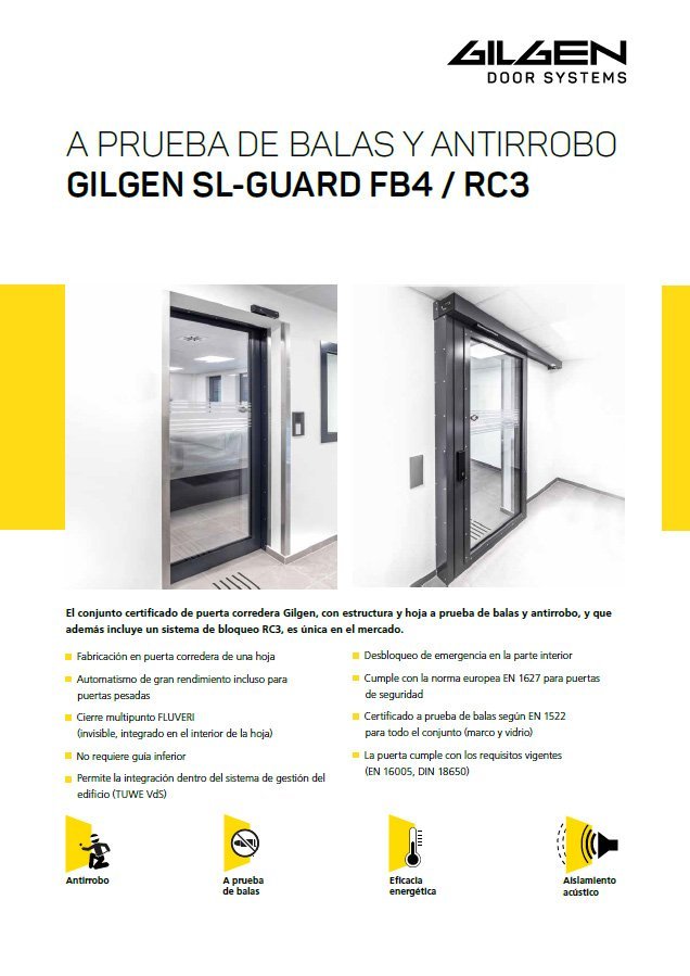 Los portones y puertas automáticos también sirven como protección antirrobo: fuera de las horas de funcionamiento y apertura, se pueden bloquear (antirrobo). Gilgen Door Systems es su socio para sistemas de puertas y portones automáticos que ofrecen un alto nivel de protección antirrobo en las clases RC2 y RC3. Gilgen Door Systems es el único proveedor en el mundo que ofrece soluciones certificadas de puertas correderas RC 2/3 con y sin guías de suelo continuas.