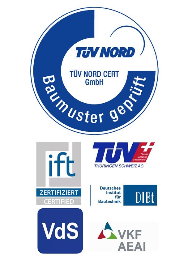 Nous comprenons que toutes les exigences de sécurité ne sont pas identiques. C'est pourquoi nous proposons une large gamme de produits spécialement conçus pour répondre à vos exigences individuelles. Qu'il s'agisse de protection contre l'incendie, de protection contre l'effraction ou d'autres propriétés spécialisées telles que la résistance au vent ou l'isolation acoustique, nous avons fait tester et certifier ces produits par l'institut de contrôle correspondant.