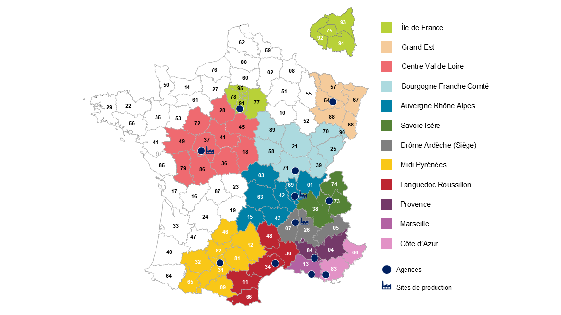 Sélectionnez la région qui vous convient sur cette carte en fonction du numéro de département recherché. Le code couleur renvoie ensuite à l'agence concernée, dans la légende. Vous trouverez ci-dessous, par agence, les noms et coordonnées des interlocuteurs prêts à répondre à toutes vos interrogations et demandes sur nos produits.